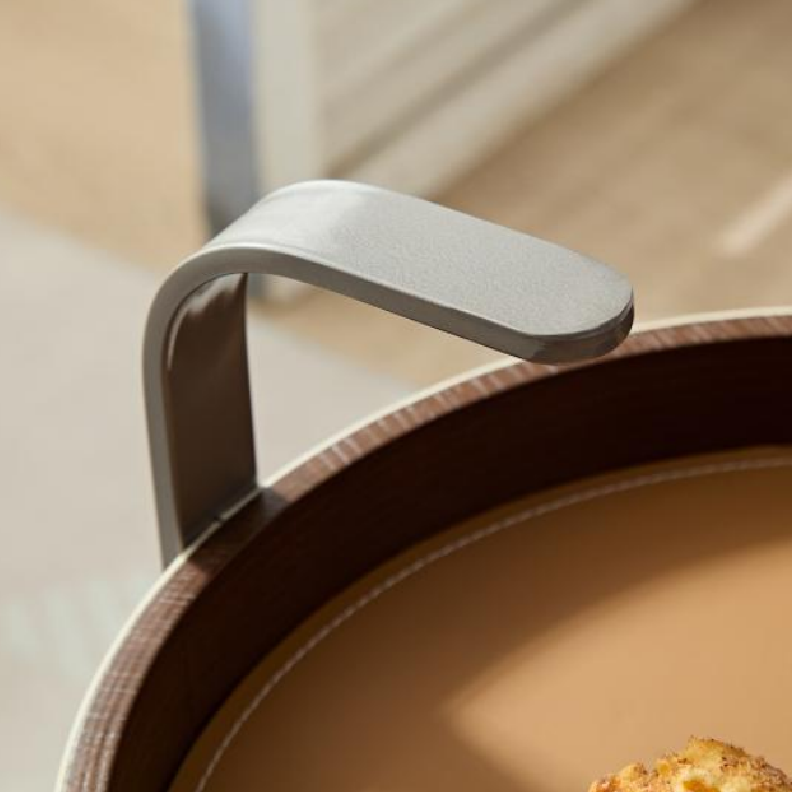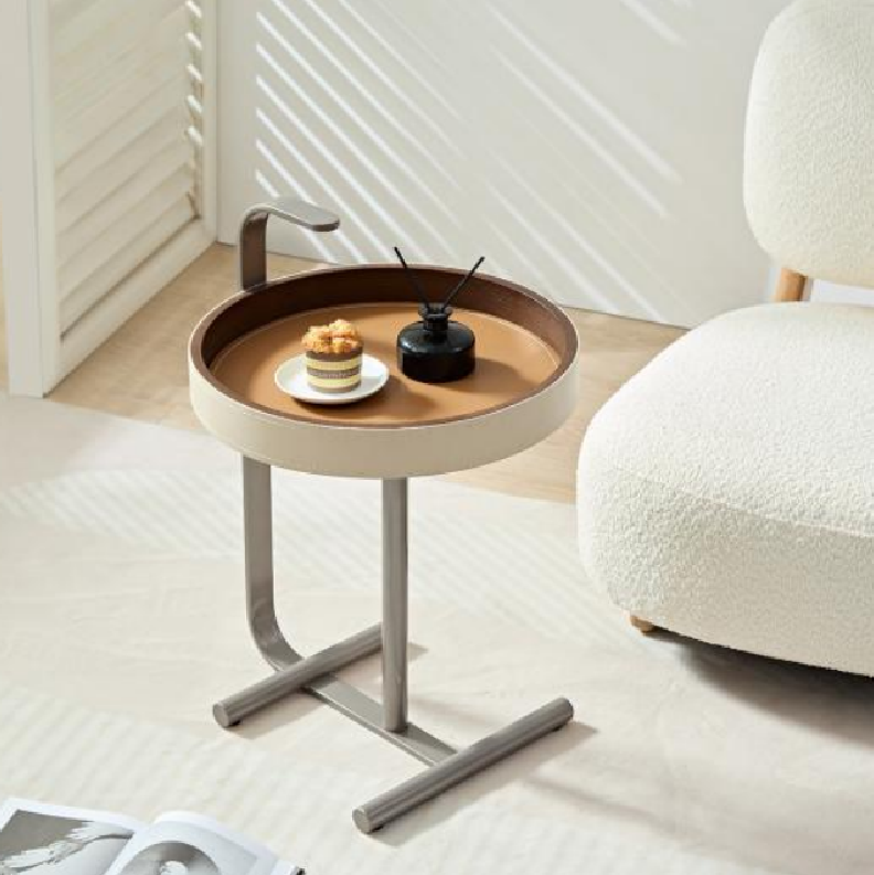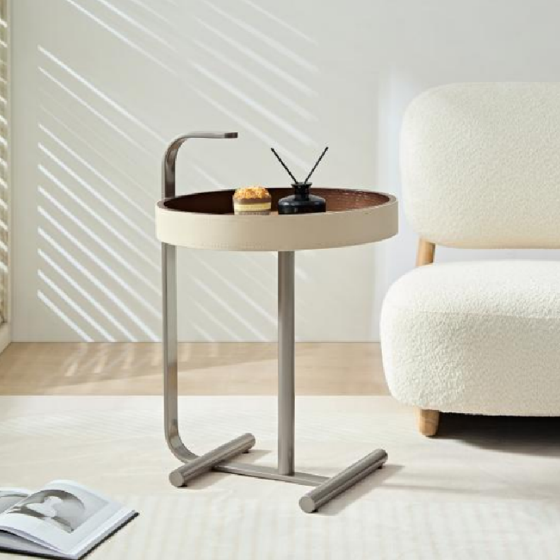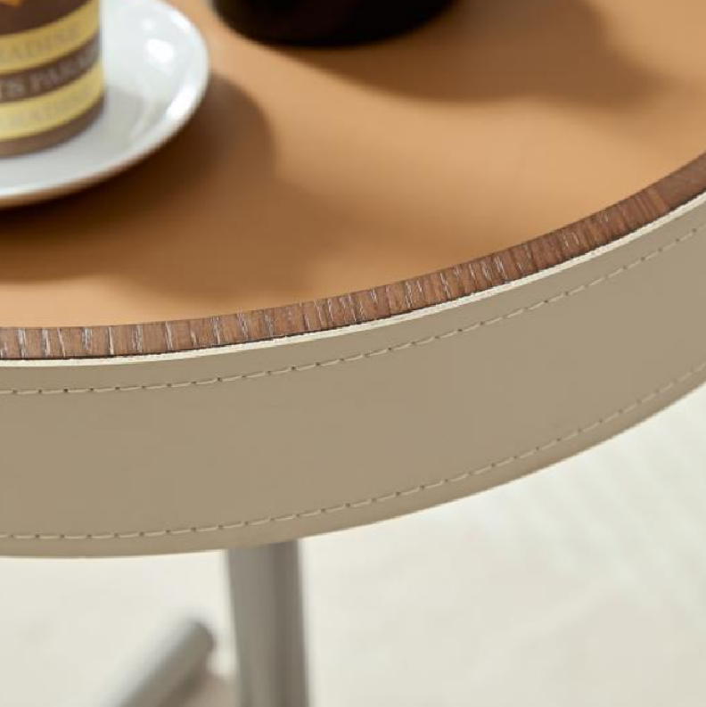 Featuring a solid wood top with metal accents,these tables embody simple yet fashionable style. The leather wrapping and off-white color palette, combined with a soft and comfortable backrest design,add a touch of elegance.