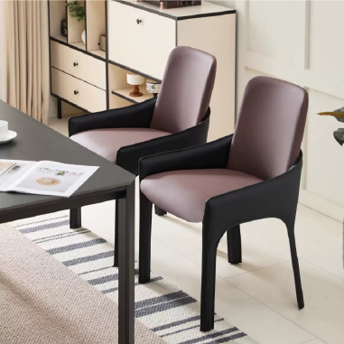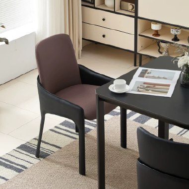 Featuring sleek carbon steel legs and a saddle leather-upholstered seat and back, this dining chair blends refined materials with minimalist contours. The soft yet durable leather adds a luxurious touch, while the wrap-around backrest provides ergonomic support for extended seating. Perfect for upscale dining settings or commercial interiors. All prices include shipping. Bigger discounts for larger purchases. Direct sales from the manufacturer, with customization options available. Compatible with any other products.