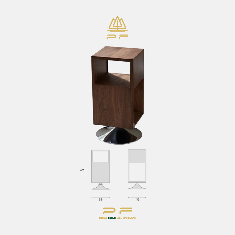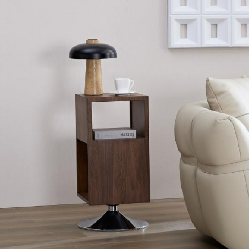 Crafted from solid wood with a rotating metal base, this table features a hollowed-out design that creates a layered look from different angles.