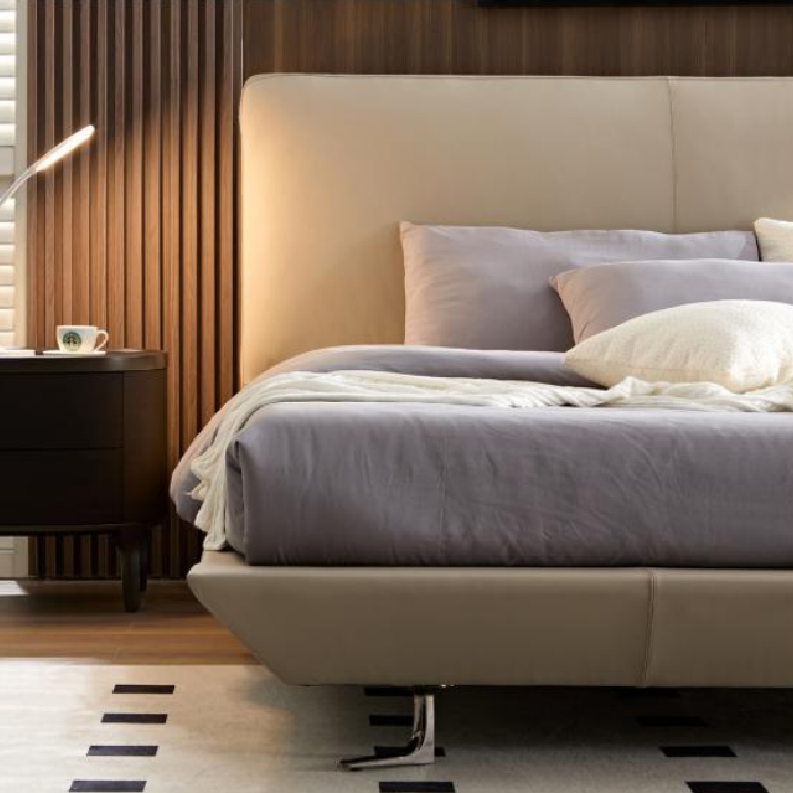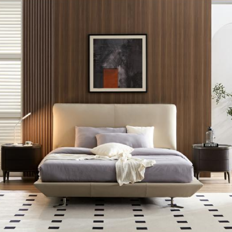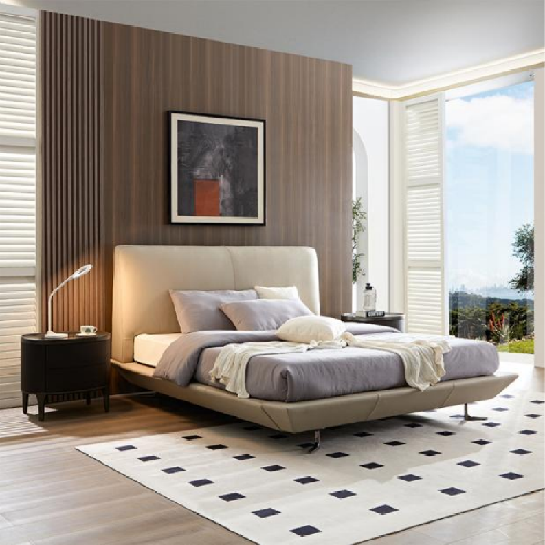 Floating Frame Queen Bed STEAD – A stylish double bed for sale with minimalist elevated bed design, easy to customize bed finish and perfect for modern interiors.